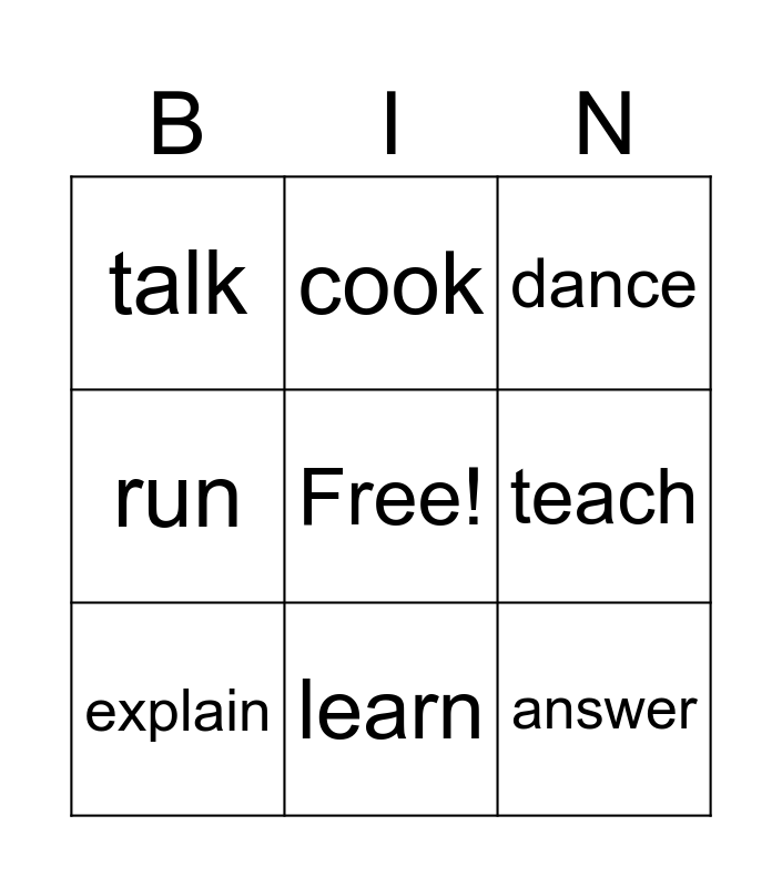 This bingo card has a free space and 26 words: drink, study, learn, draw, answer, talk, teach, cook, be, sleep, rest, walk, clean, search, wait, play, run, eat, dance, open, like, touch, buy, sing, explain and listen.