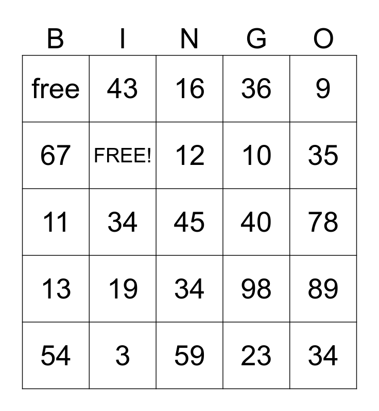 This bingo card has a free space and 26 words: 34, 23, 12, 3, 9, free, 67, 43, 78, 98, 10, 11, 89, 54, 34, 35, 36, 13, 16, 34, 35, 59, 40, 19, FREE! and FREE!.