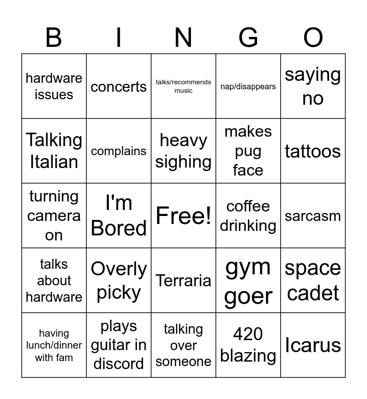 This bingo card has a free space and 24 words: Overly picky, plays guitar in discord, heavy sighing, having lunch/dinner with fam, saying no, hardware issues, Talking Italian, concerts, coffee drinking, Terraria, makes pug face, turning camera on, gym goer, space cadet, complains, 420 blazing, sarcasm, talks/recommends music, tattoos, I'm Bored, Icarus, talks about hardware, nap/disappears and talking over someone.