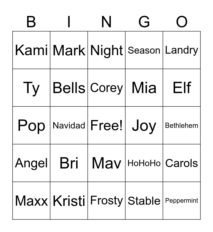 This bingo card has a free space and 24 words: Bri, Kristi, Corey, Maxx, Landry, Kami, Ty, Mark, Joy, Mav, Mia, Pop, HoHoHo, Carols, Bells, Stable, Bethlehem, Night, Elf, Navidad, Peppermint, Angel, Season and Frosty.