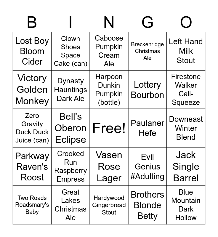This bingo card has a free space and 29 words: Two Roads Roadsmary's Baby, Winchester 522 Black Currant, Bell's Oberon Eclipse, Troegs Mad Elf, Lost Boy Bloom Cider, Caboose Pumpkin Cream Ale, Dynasty Hauntings Dark Ale, Crooked Run Raspberry Empress, Paulaner Hefe, Great Lakes Christmas Ale, Downeast Winter Blend, Blue Mountain Dark Hollow, Hardywood Gingerbread Stout, Brothers Blonde Betty, Firestone Walker Cali-Squeeze, Dogfish Head Punkin Ale, Vasen Rose Lager, Parkway Raven's Roost, Left Hand Milk Stout, Zero Gravity Duck Duck Juice (can), Evil Genius #Adulting, Lottery Bourbon, Lottery Bourbon, Victory Golden Monkey, Breckenridge Christmas Ale, Clown Shoes Space Cake (can), Jack Single Barrel, Harpoon Dunkin Pumpkin (bottle) and James River River Runner (can).