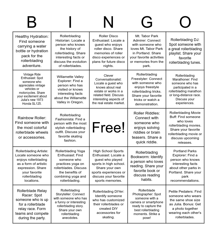 This bingo card has a free space and 35 words: Rollerblades Rookie: Find someone who has never rollerbladed before. Convince them to give it a try during the party., Doctor in Disguise: Locate someone who is knowledgeable about medical trivia or can perform a basic first aid demonstration., Jory's Fan Club: Identify someone who also has a pet and exchange a quick story about your furry friends., Willamette Valley Explorer: Find a person who has visited or knows interesting facts about the Willamette Valley in Oregon., High School Sports Enthusiast: Locate a guest who played sports in high school. Share your own sports experiences or discuss your favorite sports memories., Mt. Tabor Park Admirer: Connect with someone who loves Mt. Tabor Park in Portland. Share your favorite activities or memories from the park., Vintage Ride Enthusiast: Spot someone who appreciates vintage vehicles or motorcycles. Share your excitement about Julia's new 1973 Honda SL125., Wedding Bells Memory: Find a person who attended Julia and Bailey's wedding or someone who has attended a memorable wedding recently., Clever Conversationalist: Locate a guest who knows about real estate or works in a related field. Discuss interesting aspects of the real estate market., Globetrotter: Identify someone who has been to Vietnam or Thailand. Share travel stories or discuss exciting places you'd like to visit., Rainbow Roller: Find someone with the most colorful rollerblade wheels or accessories., Rollerblading DJ: Spot someone with a great rollerblading playlist. Share your favorite rollerblading tunes., Bike Path Buddy: Identify a person who enjoys rollerblading on bike paths. Discuss your favorite paths or share rollerblading tips., Tandem Tag Team: Locate a person willing to try tandem rollerblading with you during the party., Healthy Hydration: Find someone carrying a water bottle or hydration pack for the rollerblading adventure., Roller Riddles: Connect with someone who enjoys solving riddles or brain teasers. Share a quick riddle., Rollerblade Photographer: Spot someone with a camera or smartphone ready to capture the best rollerblading moments. Strike a pose!, Rollerblading Fashionista: Find a person with the most stylish rollerblading outfit. Discuss your favorite skating fashion., Rollerblading Artiste: Locate someone who enjoys rollerblading as a form of artistic expression. Share your favorite rollerblading locations., Petite Pedalers: Find someone who wears the same shoe size as Julia. Bonus: Get a photo together wearing each other's rollerblades., Rollerblading Bookworm: Identify a person who loves reading. Share your favorite book or discuss reading habits., Rollerblade Relay Racer: Spot someone who is up for a rollerblade relay race. Form teams and compete during the party., Portland Parks Explorer: Find a person who knows interesting facts about other parks in Portland. Share your park recommendations., Rollerblading Storyteller: Connect with someone who has a funny or interesting rollerblading story. Share your own rollerblading anecdotes., Roller Disco Enthusiast: Locate a guest who enjoys roller disco. Share memories of roller disco experiences or plans for future disco nights., Rollerblading Marathoner: Find someone who has participated in a rollerblading marathon or long-distance race. Discuss your experiences., Rollerblading Sketch Artist: Identify someone who enjoys drawing or sketching scenes from their rollerblading adventures., Rollerblading Juggler: Spot someone who can juggle while rollerblading or is willing to give it a try., Rollerblading Freestyler: Connect with someone who enjoys freestyle rollerblading tricks. Share your favorite tricks or watch a demonstration., Rollerblading Movie Buff: Find someone who loves rollerblading movies. Share your favorite rollerblading movie or discuss upcoming releases., Rollerblading Jokester: Connect with someone who enjoys telling jokes or funny stories. Share a quick rollerblading joke., Rollerblading DIYer: Identify someone who has customized their rollerblades or created DIY accessories for skating., Rollerblading Yoga Enthusiast: Find someone who practices yoga on rollerblades. Discuss the benefits of combining yoga and rollerblading., Rollerblading Historian: Locate a person who knows the history of rollerblading. Share interesting facts or discuss the evolution of rollerblades. and Rollerblading Stargazer: Find someone interested in stargazing or astronomy. Plan a rollerblading stargazing session for the night..