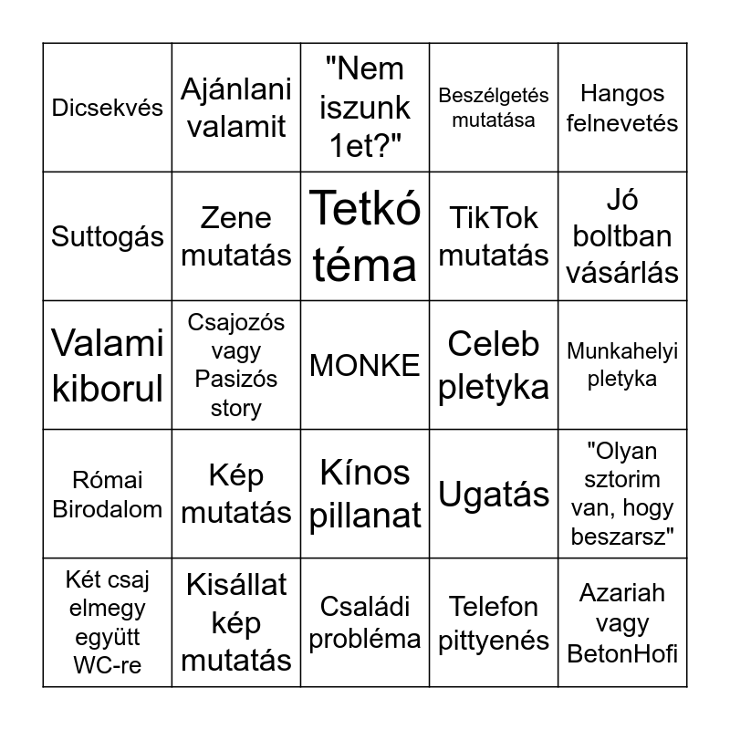 This bingo card has a free space and 24 words: Kép mutatás, Kisállat kép mutatás, Tetkó téma, Két csaj elmegy együtt WC-re, Hangos felnevetés, Dicsekvés, Suttogás, Ajánlani valamit, Celeb pletyka, Kínos pillanat, TikTok mutatás, Valami kiborul, Ugatás, "Olyan sztorim van, hogy beszarsz", Zene mutatás, Telefon pittyenés, Munkahelyi pletyka, "Nem iszunk 1et?", Jó boltban vásárlás, Csajozós vagy Pasizós story, Azariah vagy BetonHofi, Római Birodalom, Beszélgetés mutatása and Családi probléma.