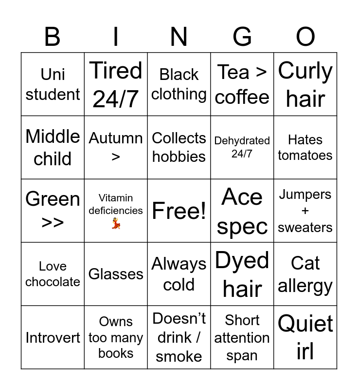 This bingo card has a free space and 24 words: Glasses, Owns too many books, Collects hobbies, Introvert, Curly hair, Uni student, Middle child, Tired 24/7, Ace spec, Always cold, Dehydrated 24/7, Green >>, Dyed hair, Cat allergy, Autumn >, Short attention span, Jumpers + sweaters, Black clothing, Hates tomatoes, Vitamin deficiencies 💃, Quiet irl, Love chocolate, Tea > coffee and Doesn’t drink / smoke.