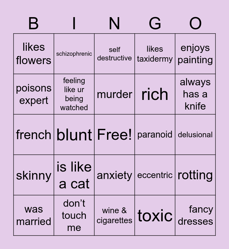 This bingo card has a free space and 24 words: is like a cat, don’t touch me, murder, was married, enjoys painting, likes flowers, poisons expert, schizophrenic, paranoid, anxiety, rich, french, eccentric, rotting, feeling like ur being watched, toxic, delusional, self destructive, always has a knife, blunt, fancy dresses, skinny, likes taxidermy and wine & cigarettes.