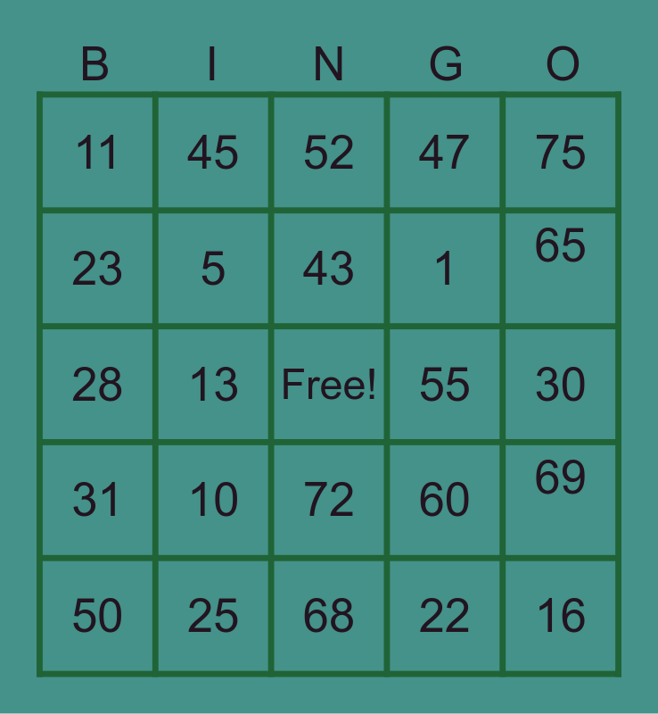 This bingo card has a free space and 24 words: 10, 25, 43, 50, 75, 11, 23, 45, 55, 72, 1, 28, 60, 69, 5, 22, 30, 52, 65, 13, 16, 31, 47 and 68.