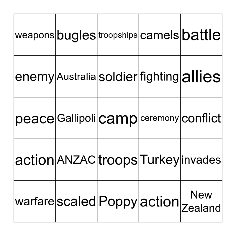This bingo card has 25 words: ANZAC, Poppy, soldier, warfare, battle, weapons, enemy, bugles, ceremony, troops, fighting, peace, Turkey, invades, Australia, New Zealand, conflict, troopships, allies, Gallipoli, camp, scaled, action, camels and action.