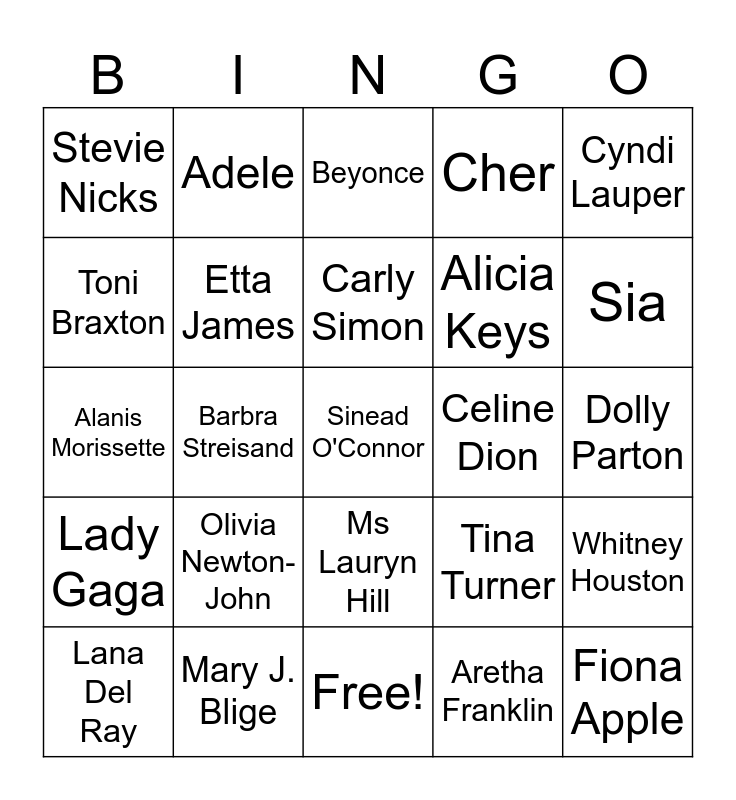 This bingo card has 31 words: Free!, Amy Winehouse, Barbra Streisand, Nina Simone, Stevie Nicks, Beyonce, Etta James, Tina Turner, Celine Dion, Aretha Franklin, Dolly Parton, Sinead O'Connor, Fiona Apple, Chaka Khan, Sia, Mariah Carey, Whitney Houston, Olivia Newton-John, Lady Gaga, Ms Lauryn Hill, Cyndi Lauper, Christina Aguilera, Lana Del Ray, Adele, Alicia Keys, Toni Braxton, Cher, Alanis Morissette, Mary J. Blige, Carly Simon and Kate Bush.