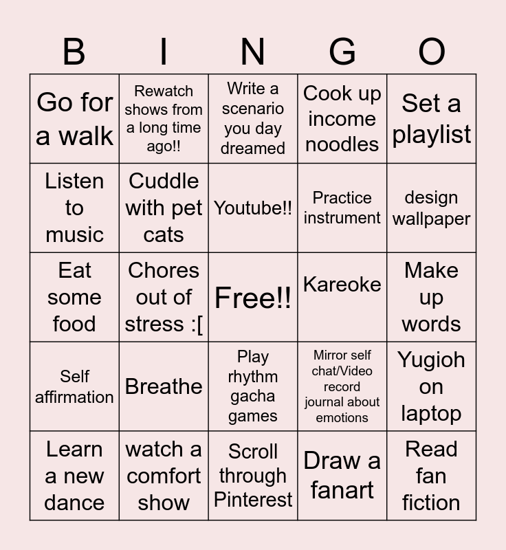 This bingo card has a free space and 24 words: Breathe, watch a comfort show, Youtube!!, Learn a new dance, Set a playlist, Go for a walk, Listen to music, Rewatch shows from a long time ago!!, Kareoke, Play rhythm gacha games, Practice instrument, Eat some food, Mirror self chat/Video record journal about emotions, Yugioh on laptop, Cuddle with pet cats, Draw a fanart, Make up words, Write a scenario you day dreamed, design wallpaper, Chores out of stress :[, Read fan fiction, Self affirmation, Cook up income noodles and Scroll through Pinterest.