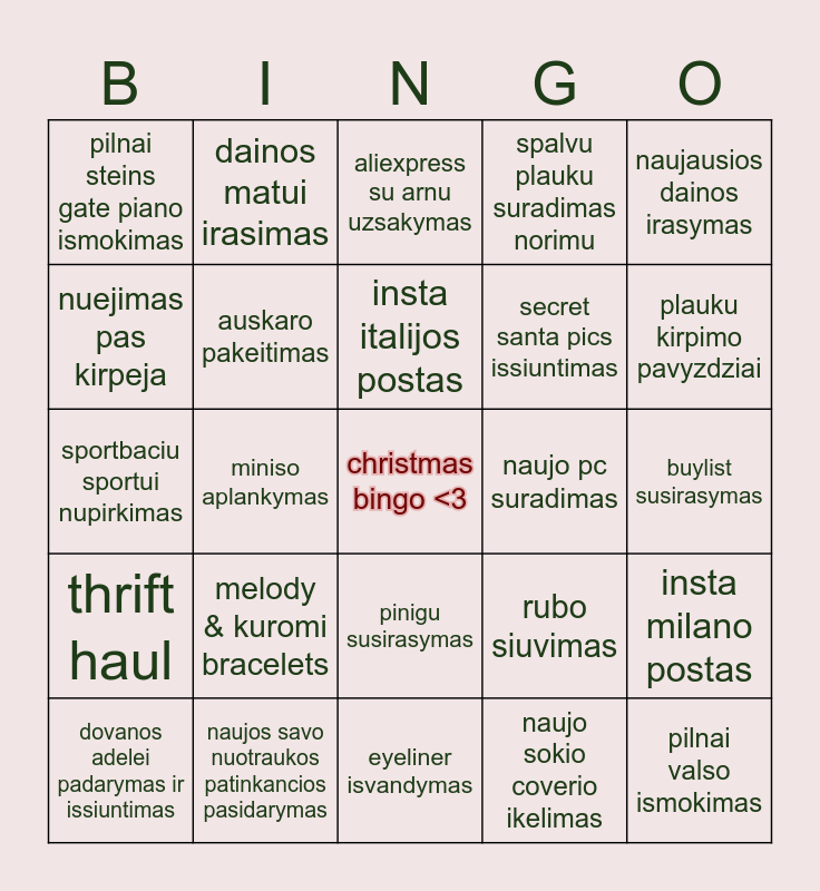 This bingo card has a free space and 24 words: melody & kuromi bracelets, naujos savo nuotraukos patinkancios pasidarymas, insta italijos postas, dovanos adelei padarymas ir issiuntimas, naujausios dainos irasymas, pilnai steins gate piano ismokimas, nuejimas pas kirpeja, dainos matui irasimas, naujo pc suradimas, pinigu susirasymas, secret santa pics issiuntimas, sportbaciu sportui nupirkimas, rubo siuvimas, insta milano postas, auskaro pakeitimas, naujo sokio coverio ikelimas, buylist susirasymas, aliexpress su arnu uzsakymas, plauku kirpimo pavyzdziai, miniso aplankymas, pilnai valso ismokimas, thrift haul, spalvu plauku suradimas norimu and eyeliner isvandymas.