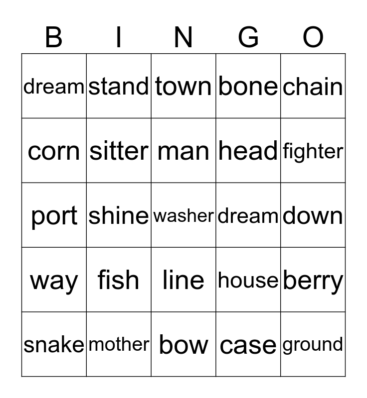 This bingo card has a free space and 24 words: fish, mother, man, snake, chain, dream, corn, stand, dream, line, head, port, house, berry, sitter, case, down, town, fighter, shine, ground, way, bone and bow.