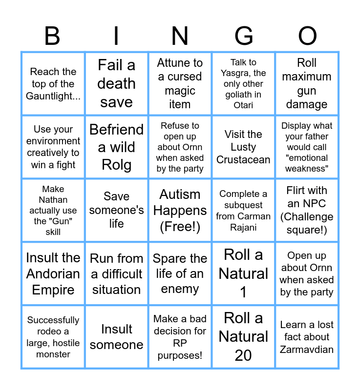 This bingo card has a free space and 24 words: Run from a difficult situation, Insult someone, Refuse to open up about Ornn when asked by the party, Successfully rodeo a large, hostile monster, Roll maximum gun damage, Reach the top of the Gauntlight..., Use your environment creatively to win a fight, Fail a death save, Complete a subquest from Carman Rajani, Spare the life of an enemy, Visit the Lusty Crustacean, Make Nathan actually use the "Gun" skill, Roll a Natural 1, Open up about Ornn when asked by the party, Befriend a wild Rolg, Roll a Natural 20, Flirt with an NPC (Challenge square!), Attune to a cursed magic item, Display what your father would call "emotional weakness", Save someone's life, Learn a lost fact about Zarmavdian, Insult the Andorian Empire, Talk to Yasgra, the only other goliath in Otari and Make a bad decision for RP purposes!.
