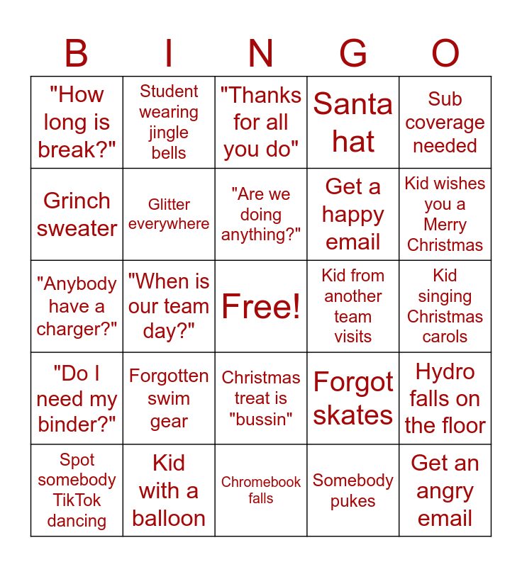 This bingo card has a free space and 32 words: Somebody pukes, Student eating a candy cane, "When is our team day?", "When does break start?", "Do I need my binder?", Glitter everywhere, Sub coverage needed, Hydro falls on the floor, Student wearing jingle bells, Confiscate a phone, "Are we doing anything?", "Thanks for all you do", Somebody drinking Starbucks, Somebody quotes a Christmas movie, Kid from another team visits, Unnecessary Reply all, Spot somebody TikTok dancing, "Anybody have a charger?", Christmas treat is "bussin", Forgotten swim gear, Forgot skates, Student in shorts, Kid singing Christmas carols, Kid with a balloon, Get an angry email, Santa hat, Get a happy email, Grinch sweater, "How long is break?", Chromebook falls, Treats in staff lounge and Kid wishes you a Merry Christmas.