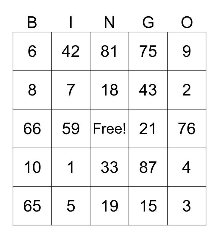This bingo card has a free space and 24 words: 1, 5, 18, 65, 9, 6, 8, 42, 21, 33, 43, 66, 87, 4, 7, 15, 76, 81, 2, 59, 3, 10, 75 and 19.