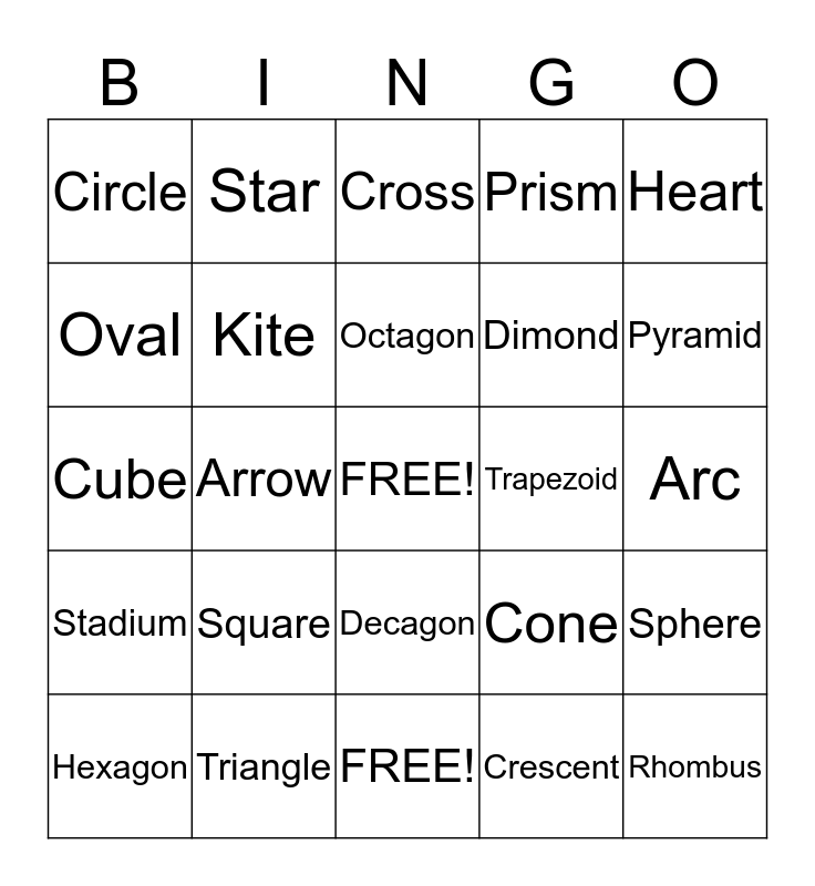 This bingo card has a free space and 24 words: Square, Triangle, Octagon, Hexagon, Heart, Circle, Oval, Star, Trapezoid, Decagon, Dimond, Cube, Cone, Sphere, Kite, Crescent, Arc, Cross, Pyramid, Arrow, Rhombus, Stadium, Prism and FREE!.