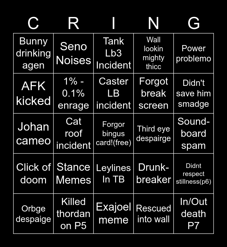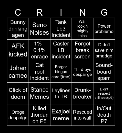 This bingo card has a free space and 24 words: Stance Memes, Killed thordan on P5, Caster LB incident, Orbge despaige, Power problemo, Bunny drinking agen, AFK kicked, Seno Noises, Third eye despairge, Leylines In TB, Forgot break screen, Johan cameo, Drunk-breaker, Didnt respect stillness(p6), 1% - 0.1% enrage, Rescued into wall, Sound-board spam, Tank Lb3 Incident, Didn't save him smadge, Cat roof incident, In/Out death P7, Click of doom, Wall lookin mighty thicc and Exajoel meme.