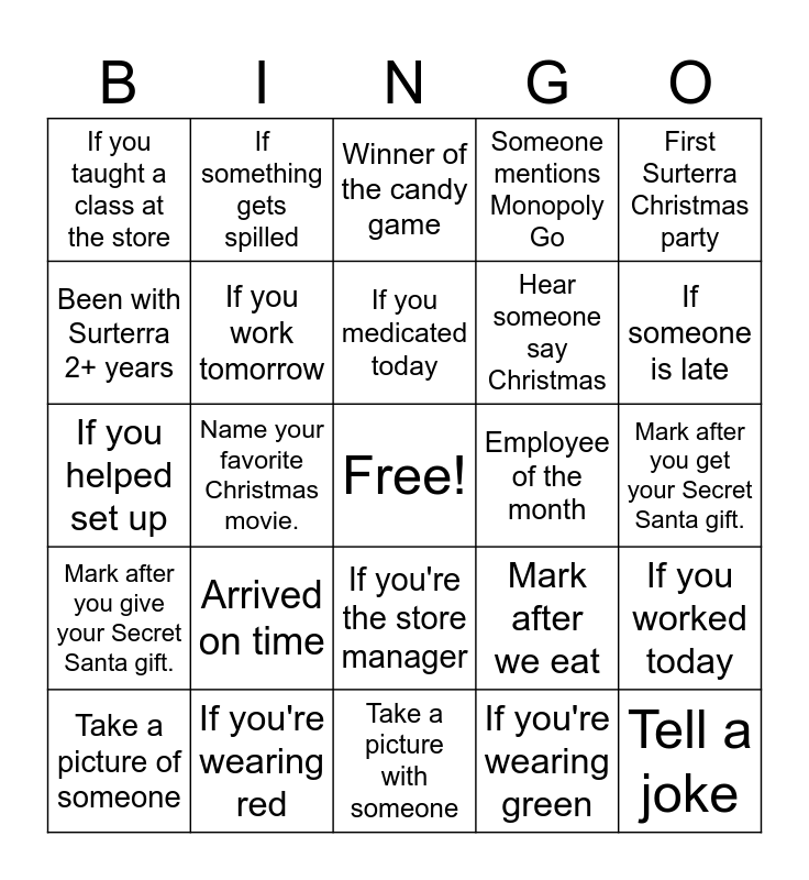This bingo card has a free space and 24 words: Take a picture of someone, Arrived on time, If you medicated today, If you're wearing green, First Surterra Christmas party, If you taught a class at the store, If something gets spilled, Winner of the candy game, Employee of the month, Mark after you get your Secret Santa gift., If you helped set up, If you work tomorrow, Mark after we eat, If you worked today, Been with Surterra 2+ years, If you're wearing red, Take a picture with someone, Someone mentions Monopoly Go, If someone is late, Mark after you give your Secret Santa gift., Name your favorite Christmas movie., If you're the store manager, Hear someone say Christmas and Tell a joke.