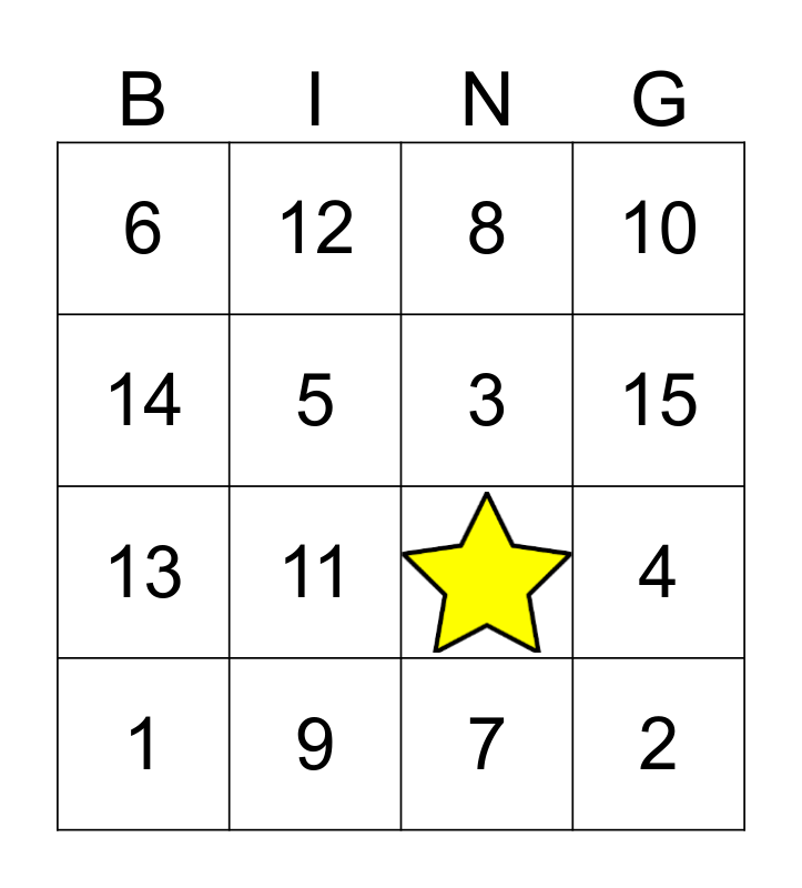 This bingo card has a free space and 15 words: 1, 2, 8, 6, 15, 14, 11, 7, 5, 13, 4, 10, 3, 12 and 9.