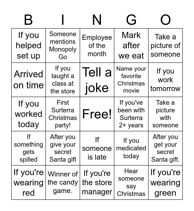 This bingo card has a free space and 24 words: After you give your secret Santa gift, Winner of the candy game., Tell a joke, If you're wearing red, Take a picture of someone, If you helped set up, Arrived on time, Someone mentions Monopoly Go, If you've been with Surterra 2+ years, If someone is late, Name your favorite Christmas movie, If you worked today, If you medicated today, After you get your secret Santa gift., If you taught a class at the store, Hear someone say Christmas, Take a picture with someone, Employee of the month, If you work tomorrow, First Surterra Christmas party!, If you're wearing green, If something gets spilled, Mark after we eat and If you're the store manager.