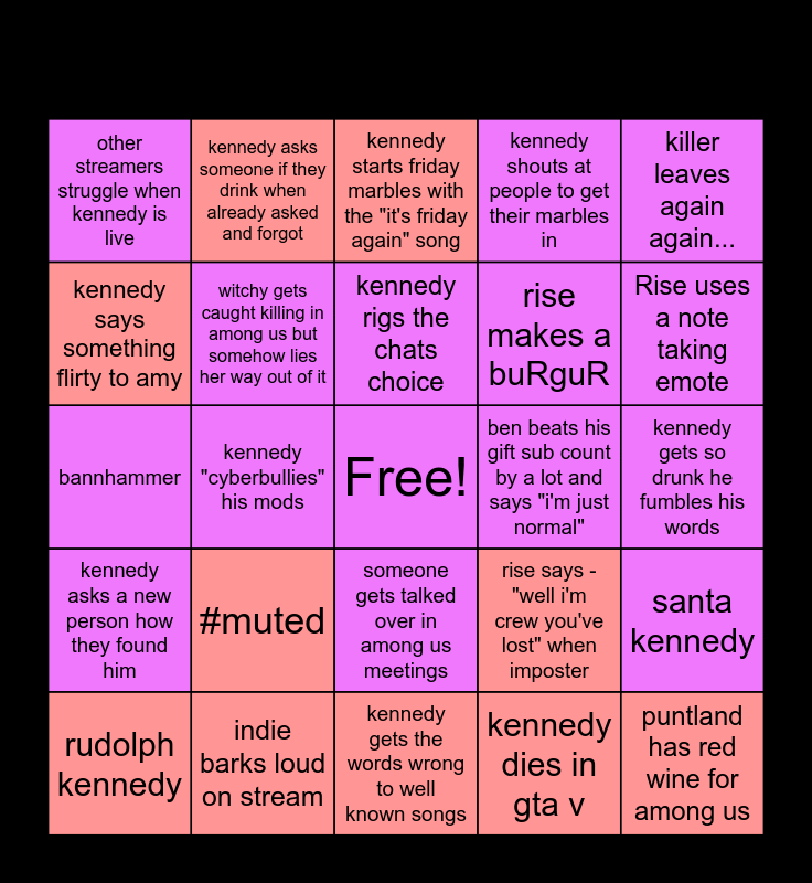 This bingo card has a free space and 44 words: kennedy mentions being a full time streamer, #muted, killer leaves..., kennedy dies in gta v, kennedy makes whale jokes when angel joins, huddy joins in for s4s, witchy gets caught killing in among us but somehow lies her way out of it, !chair hype, kennedy shouts at people to get their marbles in, puntland has red wine for among us, other streamers struggle when kennedy is live, indie barks loud on stream, rise says - "well i'm crew you've lost" when imposter, kennedy gets so drunk he fumbles his words, kennedy ignores a comment in chat, killer leaves again..., kennedy gets the words wrong to well known songs, ben beats his gift sub count by a lot and says "i'm just normal", kennedy's mood changes drastrically depending on viewer count, bannhammer, kennedy asks someone if they drink when already asked and forgot, someone gets talked over in among us meetings, angel talks about her love life in a little too much detail, killer leaves again again..., jet mentions "khaleesi" in chat, kennedy FINALLY plays more halo, kennedy rigs the chats choice, kennedy does the "girl voice" in barbie girl, santa kennedy, rudolph kennedy, kennedy "hydrates" with beer, kennedy starts friday marbles with the "it's friday again" song, killer !bduel people that aren't even in chat, someone !gamble all and loses all their points, kennedy asks a new person how they found him, someone complains that chat is "too busy", botisimo is still alive AFTER the funeral, someone misspells !play ACCIDENTALLY, Rise uses a note taking emote, kennedy says something flirty to amy, kennedy "cyberbullies" his mods, kennedy puts us on airship with no warning, rise makes a buRguR and matteh misspells !play on purpose.