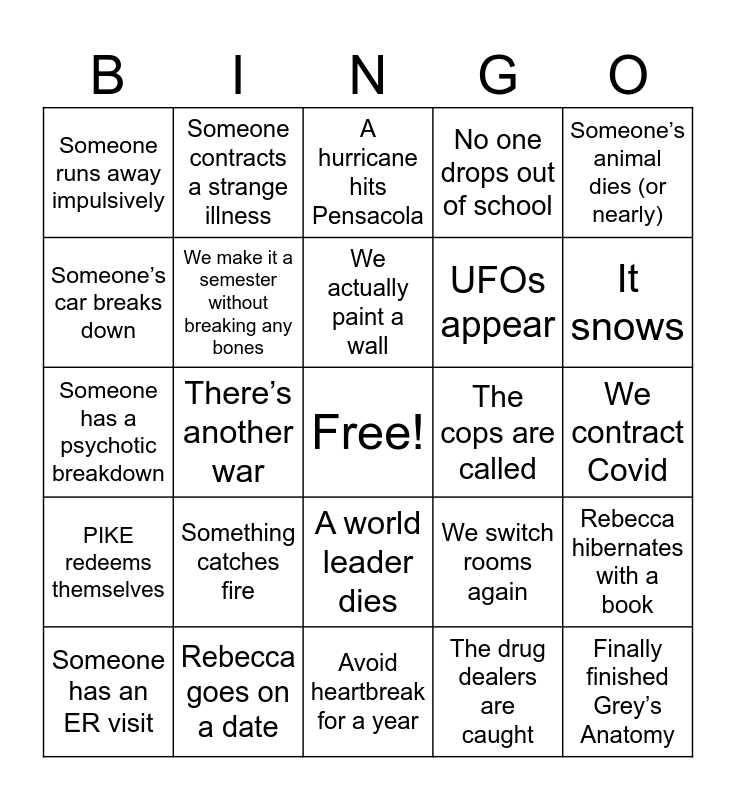 This bingo card has a free space and 24 words: Something catches fire, Rebecca goes on a date, We actually paint a wall, Someone has an ER visit, Someone’s animal dies (or nearly), Someone runs away impulsively, Someone’s car breaks down, Someone contracts a strange illness, The cops are called, A world leader dies, UFOs appear, Someone has a psychotic breakdown, We switch rooms again, Rebecca hibernates with a book, We make it a semester without breaking any bones, The drug dealers are caught, We contract Covid, A hurricane hits Pensacola, It snows, There’s another war, Finally finished Grey’s Anatomy, PIKE redeems themselves, No one drops out of school and Avoid heartbreak for a year.