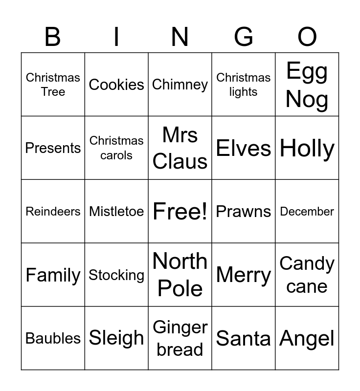 This bingo card has a free space and 28 words: Candy cane, Rudolf, Elves, Santa, Presents, Chimney, Cookies, Family, Prawns, Baubles, Reindeers, Christmas lights, Sleigh, Ginger bread, Holly, Wreath, Stocking, Christmas carols, Mrs Claus, North Pole, Christmas Tree, Ho Ho Ho, Angel, Mistletoe, December, Merry, Egg Nog and Holidays.