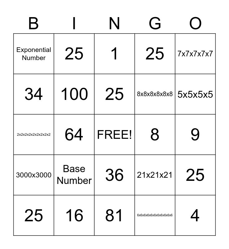 This bingo card has a free space and 29 words: 25, 11x11x11, 64, 9x9x9x9x9, Exponential Number, 1, 100, Base Number, 8, 16, 9, 4, 81, 6x6x6x6x6x6x6x6x6x6x6, 5x5x5x5, 49, 36, 3000x3000, 7x7x7x7x7, 2x2x2x2x2x2x2x2x2, 21x21x21, 27, 8x8x8x8x8x8, 34, 25, 25, 25, 25 and 25.