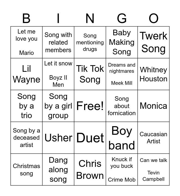 This bingo card has a free space and 29 words: Christmas song, Sexy Redd, Song by a girl group, Beyonce, Let me love you Mario, Song mentioning drugs, Let it snow Boyz II Men, Usher, Song about fornication, Dang along song, Monica, Can we talk Tevin Campbell, Chris Brown, Knuck if you buck Crime Mob, Whitney Houston, Rap Song, Duet, Song by a deceased artist, Twerk Song, Song by a trio, Boy band, Love Song, Dreams and nightmares Meek Mill, Lil Wayne, Baby Making Song, Song with related members, Caucasian Artist, Tik Tok Song and Song about getting money.