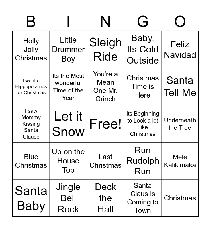 This bingo card has a free space and 30 words: Jingle Bell Rock, Rockin' around the Christmas Tree, Let it Snow, All I want for Christmas is You, Holly Jolly Christmas, Sleigh Ride, Its the Most wonderful Time of the Year, Last Christmas, Its Beginning to Look a lot Like Christmas, Deck the Hall, Underneath the Tree, Christmas, Santa Claus is Coming to Town, Jingle Bells, Santa Tell Me, Little Saint Nick, Run Rudolph Run, Blue Christmas, Up on the House Top, Feliz Navidad, I saw Mommy Kissing Santa Clause, Grandma Got Run Over by a Reinder, Little Drummer Boy, Christmas Time is Here, I want a Hippopotamus for Christmas, Baby, Its Cold Outside, Mele Kalikimaka, Santa Baby, You're a Mean One Mr. Grinch and One More Sleep til Christmas.