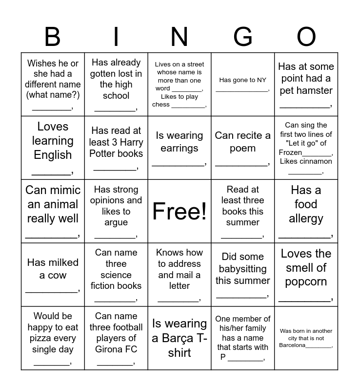 This bingo card has a free space and 24 words: Can name three science fiction books ________,, Can name three football players of Girona FC _______,, Is wearing earrings _________,, Would be happy to eat pizza every single day _______,, Has at some point had a pet hamster _________,, Wishes he or she had a different name (what name?) ________,, Loves learning English ______,, Has already gotten lost in the high school ________,, Read at least three books this summer ________,, Knows how to address and mail a letter ________,, Can recite a poem _________,, Can mimic an animal really well ________,, Did some babysitting this summer _________,, Loves the smell of popcorn ________,, Has read at least 3 Harry Potter books ________,, One member of his/her family has a name that starts with P ________,, Has a food allergy ________,, Lives on a street whose name is more than one word ________, Likes to play chess _________,, Can sing the first two lines of "Let it go" of Frozen_______, Likes cinnamon ________,, Has strong opinions and likes to argue ________,, Was born in another city that is not Barcelona________,, Has milked a cow _________,, Has gone to NY ______________, and Is wearing a Barça T-shirt.