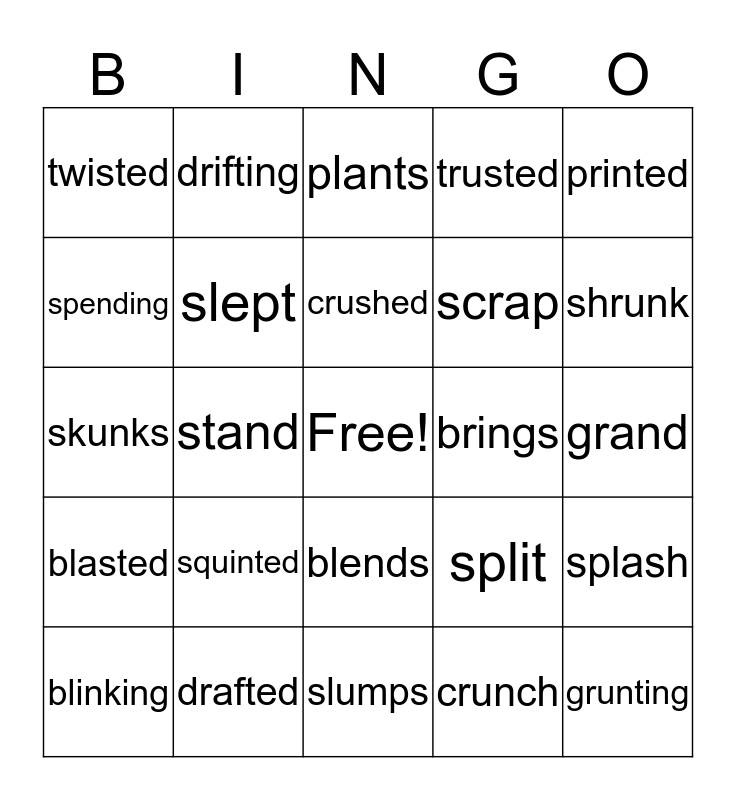 This bingo card has a free space and 24 words: squinted, drafted, crushed, blinking, printed, twisted, spending, drifting, brings, blends, scrap, skunks, split, splash, slept, crunch, grand, plants, shrunk, stand, grunting, blasted, trusted and slumps.