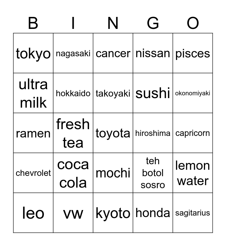 This bingo card has 25 words: coca cola, kyoto, takoyaki, leo, pisces, tokyo, ultra milk, nagasaki, hiroshima, mochi, sushi, ramen, teh botol sosro, lemon water, hokkaido, sagitarius, capricorn, cancer, okonomiyaki, fresh tea, toyota, vw, chevrolet, nissan and honda.