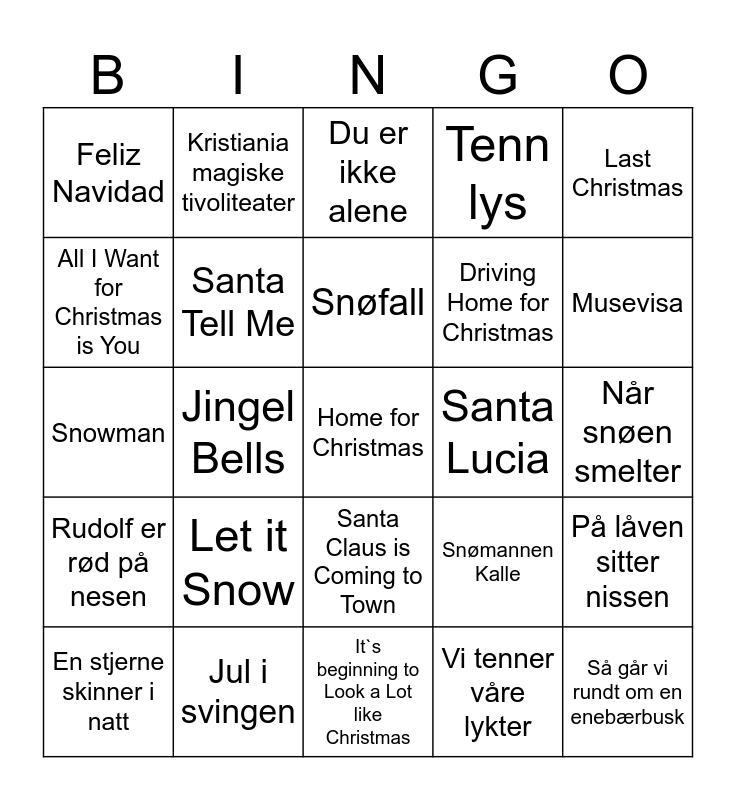 This bingo card has a free space and 24 words: Let it Snow, Jul i svingen, Snøfall, En stjerne skinner i natt, Last Christmas, Feliz Navidad, All I Want for Christmas is You, Kristiania magiske tivoliteater, Santa Lucia, Santa Claus is Coming to Town, Driving Home for Christmas, Snowman, Snømannen Kalle, På låven sitter nissen, Santa Tell Me, Vi tenner våre lykter, Når snøen smelter, Du er ikke alene, Musevisa, Jingel Bells, Så går vi rundt om en enebærbusk, Rudolf er rød på nesen, Tenn lys and It`s beginning to Look a Lot like Christmas.