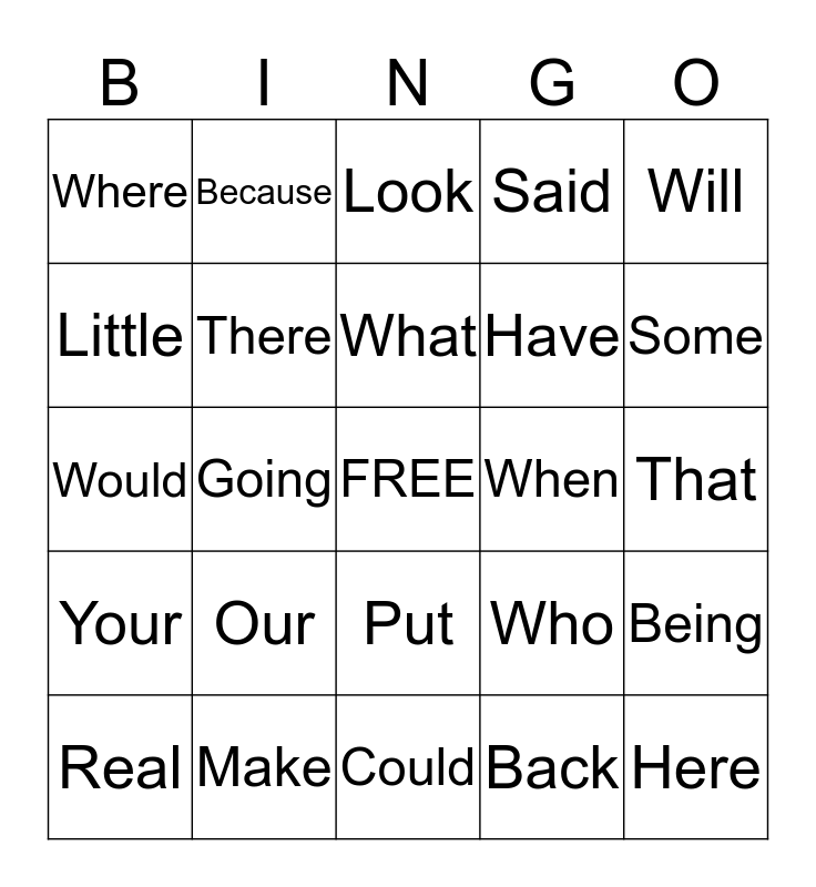 This bingo card has a free space and 24 words: Our, Make, What, Real, Will, Where, Little, Because, When, Put, Have, Would, Who, Being, There, Back, That, Look, Some, Going, Here, Your, Said and Could.