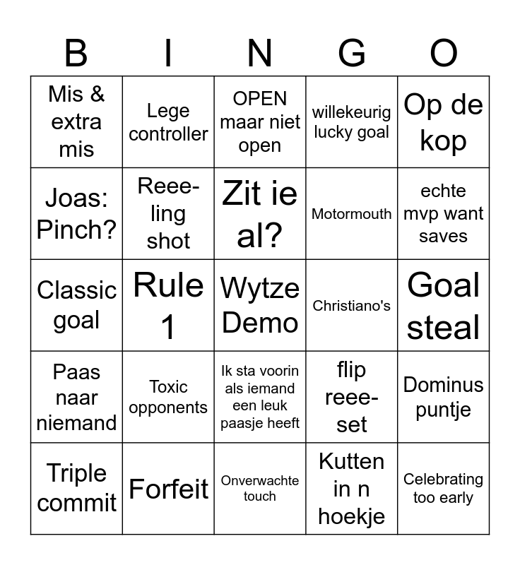 This bingo card has a free space and 24 words: Toxic opponents, Forfeit, Zit ie al?, Triple commit, Op de kop, Mis & extra mis, Joas: Pinch?, Lege controller, Christiano's, Ik sta voorin als iemand een leuk paasje heeft, Motormouth, Classic goal, flip reee-set, Dominus puntje, Reee-ling shot, Kutten in n hoekje, Goal steal, OPEN maar niet open, echte mvp want saves, Rule 1, Celebrating too early, Paas naar niemand, willekeurig lucky goal and Onverwachte touch.