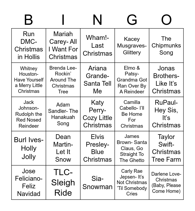 This bingo card has 29 words: Jose Feliciano- Feliz Navidad, Eartha Kitt- Santa Baby, Adam Sandler- The Hanakuah Song, Darlene Love- Christmas (Baby, Please Come Home), Run DMC- Christmas in Hollis, Wham!- Last Christmas, Brenda Lee- Rockin’ Around The Christmas Tree, Dean Martin- Let It Snow, Camilla Cabello- I’ll Be Home For Christmas, TLC- Sleigh Ride, RuPaul- Hey Sis, It’s Christmas, Katy Perry- Cozy Little Christmas, Sia- Snowman, Carly Rae Jepsen- It’s Not Christmas ’Til Somebody Cries, Jonas Brothers- Like It’s Christmas, South Park- Dreidel, Dreidel, Dreidel, Elvis Presley- Blue Christmas, Burl Ives- Holly Jolly, The Chipmunks Song, Jack Johnson- Rudolph the Red Nosed Reindeer, James Brown- Santa Claus, Go Straight To The Ghetto, Bing Crosby- Silver Bells, Elmo & Patsy-Grandma Got Ran Over By A Reindeer, Whitney Houston- Have Yourself a Merry Little Christmas, Kacey Musgraves- Glittery, Mariah Carey- All I Want For Christmas, Taylor Swift- Christmas Tree Farm, Ariana Grande- Santa Tell Me and Boris Karloff- (You’re A Mean One) Mister Grinch.
