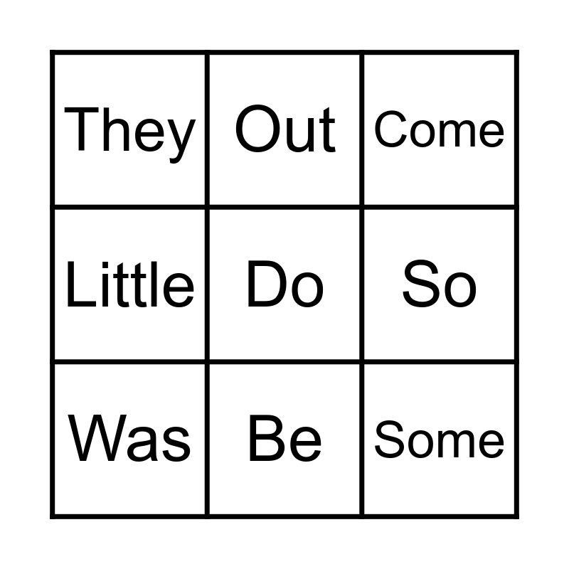 This bingo card has 9 words: Was, Come, Out, Little, They, So, Do, Some and Be.