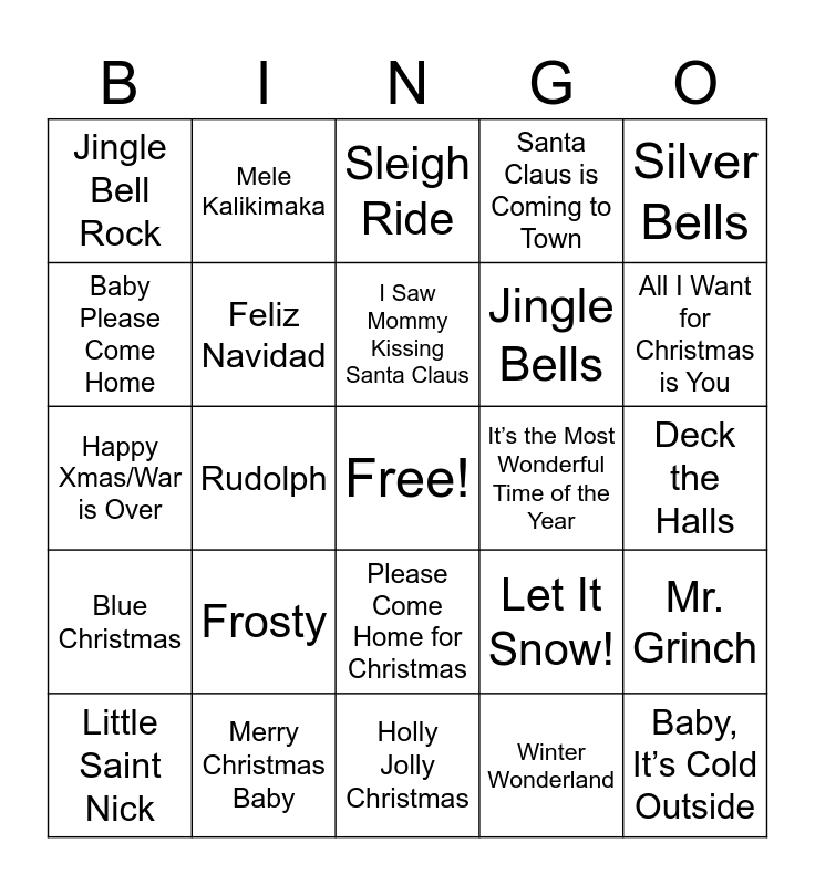 This bingo card has a free space and 31 words: Holly Jolly Christmas, It’s Beginning to Look a lot like Christmas, Rudolph, Rockin’ Around the Christmas Tree, Jingle Bell Rock, Sleigh Ride, Feliz Navidad, Let It Snow!, It’s the Most Wonderful Time of the Year, Winter Wonderland, Deck the Halls, Baby, It’s Cold Outside, Here Comes Santa Claus, Santa Baby, All I Want for Christmas is You, Happy Holidays, Mr. Grinch, Frosty, Blue Christmas, Please Come Home for Christmas, Silver Bells, Last Christmas, Little Saint Nick, Mele Kalikimaka, Jingle Bells, Baby Please Come Home, Santa Claus is Coming to Town, Happy Xmas/War is Over, Merry Christmas Baby, I Saw Mommy Kissing Santa Claus and This Christmas.