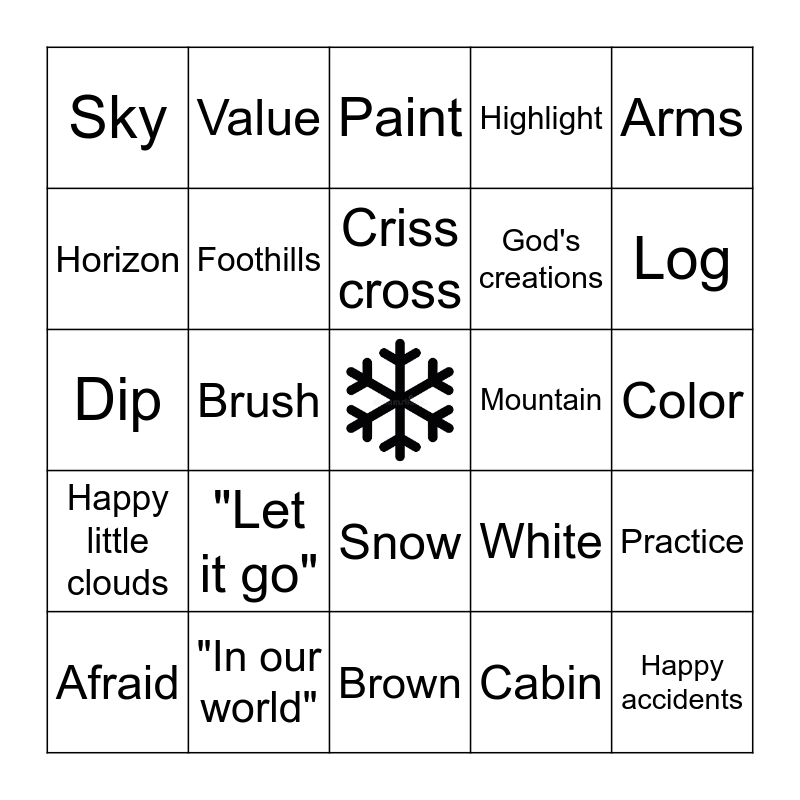 This bingo card has a free space and 29 words: Afraid, Alaska, Brush, Snow, Sky, Paint, Foothills, "Let it go", Mountain, "In our world", Color, Happy accidents, Brown, Cabin, Log, Chimney, Snow, Happy little clouds, Arms, Dip, White, Birds, God's creations, Horizon, Highlight, Value, Practice, Criss cross and Coat.