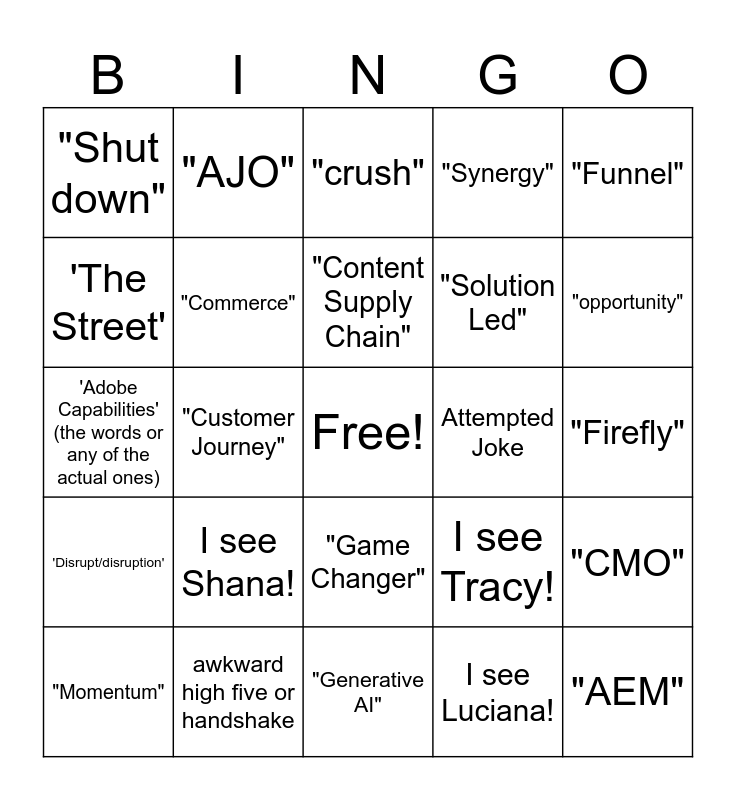 This bingo card has a free space and 24 words: I see Shana!, awkward high five or handshake, "Content Supply Chain", "Momentum", "Funnel", "Shut down", 'The Street', "AJO", Attempted Joke, "Game Changer", "Solution Led", 'Adobe Capabilities' (the words or any of the actual ones), I see Tracy!, "CMO", "Commerce", I see Luciana!, "Firefly", "crush", "opportunity", "Customer Journey", "AEM", 'Disrupt/disruption', "Synergy" and "Generative AI".