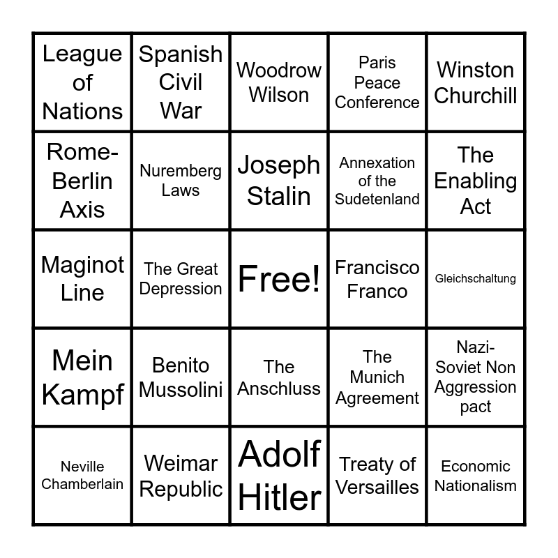 This bingo card has a free space and 25 words: Benito Mussolini, Adolf Hitler, Joseph Stalin, Neville Chamberlain, Winston Churchill, League of Nations, Rome-Berlin Axis, Spanish Civil War, Francisco Franco, The Anschluss, Annexation of the Sudetenland, Maginot Line, The Munich Agreement, Nazi-Soviet Non Aggression pact, Nuremberg Laws, The NEP (New Economic Policy), Gleichschaltung, Woodrow Wilson, The Enabling Act, The Great Depression, Economic Nationalism, Weimar Republic, Mein Kampf, Paris Peace Conference and Treaty of Versailles.