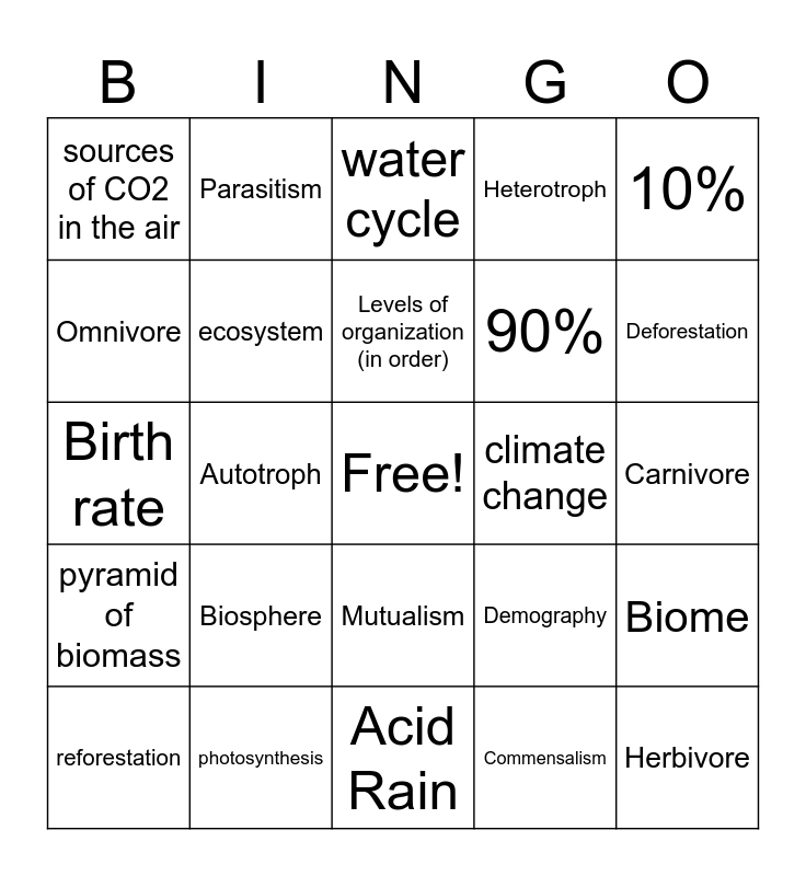 This bingo card has a free space and 38 words: organism, population, community, ecosystem, Biome, Biosphere, Levels of organization (in order), sun, 10%, 90%, Autotroph, Heterotroph, Herbivore, Carnivore, Omnivore, pyramid of biomass, pyramid of energy, water cycle, carbon cycle, climate change, sources of CO2 in the air, photosynthesis, Deforestation, reforestation, Energy, Acid Rain, Weather, Climate, Abiotic factors, Biotic factors, symbiosis, Mutualism, Commensalism, Parasitism, Predation, Demography, Birth rate and Death rate.