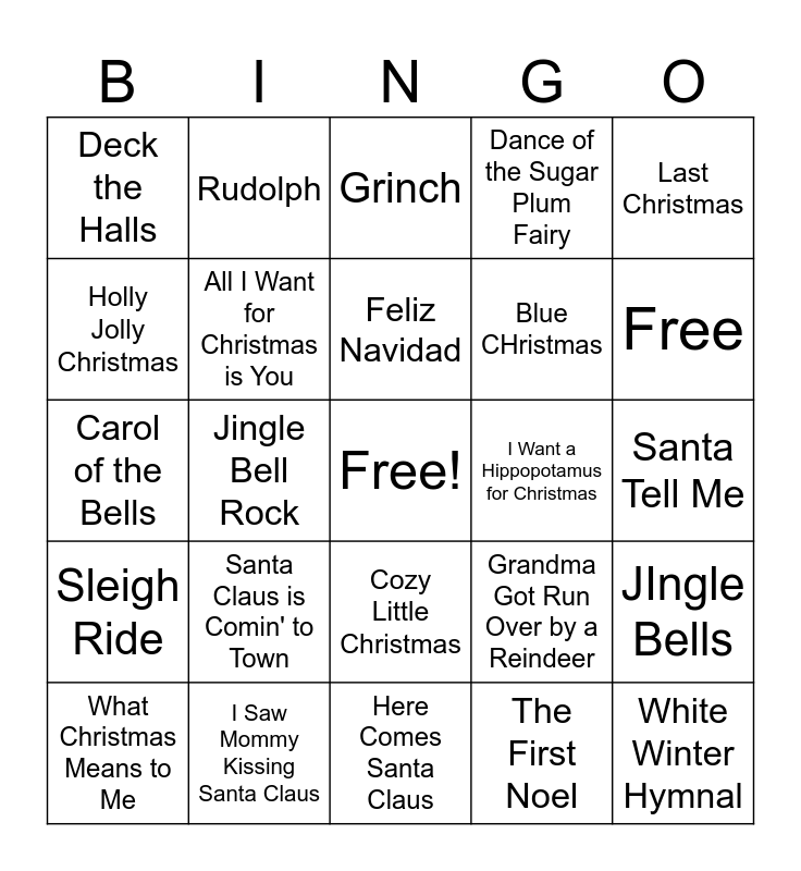 This bingo card has a free space and 33 words: Rockin' Around the Christmas Tree, Let it Snow, Jingle Bell Rock, It's the Most Wonderful Time of the Year, Sleigh Ride, All I Want for Christmas is You, Last Christmas, What Christmas Means to Me, Rudolph, Frosty, Feliz Navidad, Grinch, White Christmas, Christmas Wrapping, I Want a Hippopotamus for Christmas, Free, I Saw Mommy Kissing Santa Claus, Carol of the Bells, Santa Claus is Comin' to Town, Grandma Got Run Over by a Reindeer, Cozy Little Christmas, Mistletoe, Deck the Halls, Santa Tell Me, Here Comes Santa Claus, White Winter Hymnal, Dance of the Sugar Plum Fairy, Blue CHristmas, Holly Jolly Christmas, JIngle Bells, Silent Night, The First Noel and Little Saint Nick.