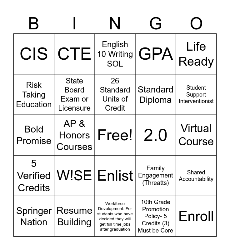 This bingo card has a free space and 24 words: W!SE, Resume Building, 26 Standard Units of Credit, Springer Nation, Life Ready, CIS, Risk Taking Education, CTE, 2.0, Enlist, Standard Diploma, Bold Promise, Family Engagement (Threatts), Shared Accountability, State Board Exam or Licensure, 10th Grade Promotion Policy- 5 Credits (3) Must be Core, Virtual Course, English 10 Writing SOL, Student Support Interventionist, AP & Honors Courses, Enroll, 5 Verified Credits, GPA and Workforce Development: For students who have decided they will get full time jobs after graduation.