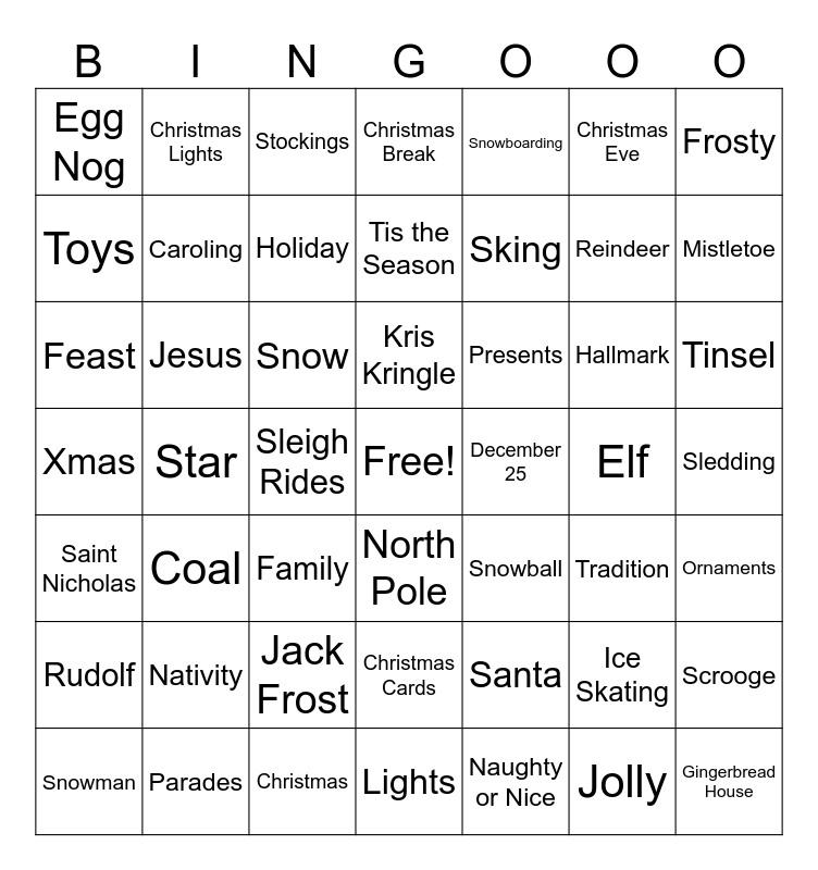 This bingo card has a free space and 48 words: Santa, Reindeer, Lights, Star, Snow, Sledding, Christmas Lights, Parades, Christmas Eve, North Pole, Frosty, Christmas Break, Hallmark, Presents, Rudolf, Elf, Toys, Mistletoe, Ice Skating, Snowboarding, Sking, Sleigh Rides, Egg Nog, Caroling, Scrooge, Holiday, Tinsel, Snowman, Kris Kringle, Jesus, Jolly, December 25, Ornaments, Nativity, Xmas, Snowball, Tradition, Feast, Family, Jack Frost, Saint Nicholas, Gingerbread House, Stockings, Christmas, Tis the Season, Christmas Cards, Coal and Naughty or Nice.