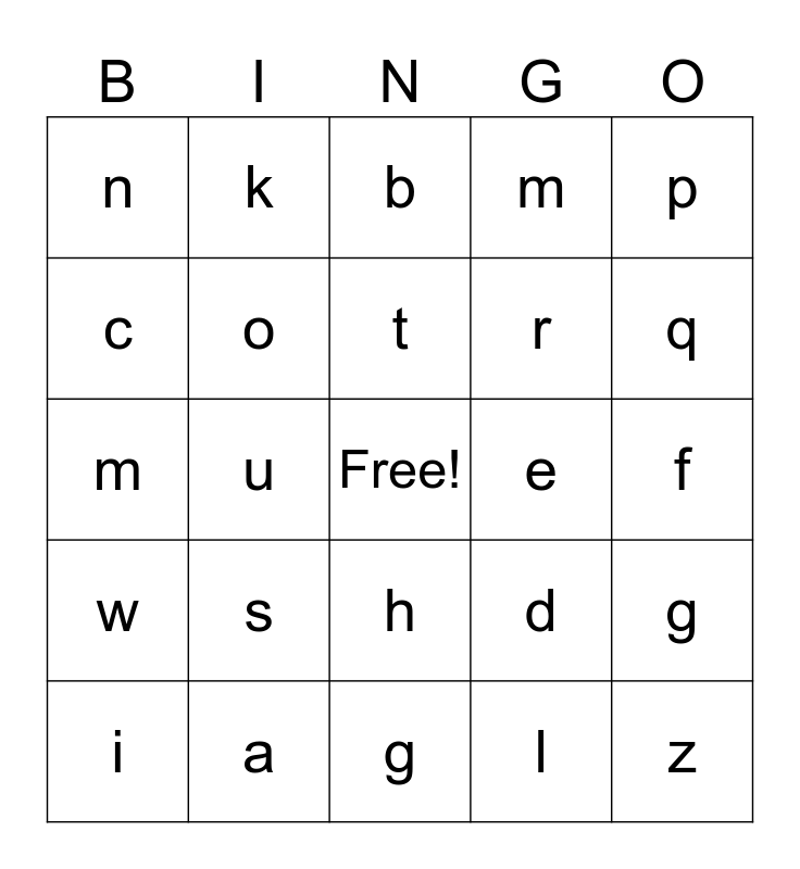 This bingo card has a free space and 24 words: s, a, t, i, p, n, c, k, e, h, r, m, d, g, o, l, f, b, q, u, z, w, m and g.