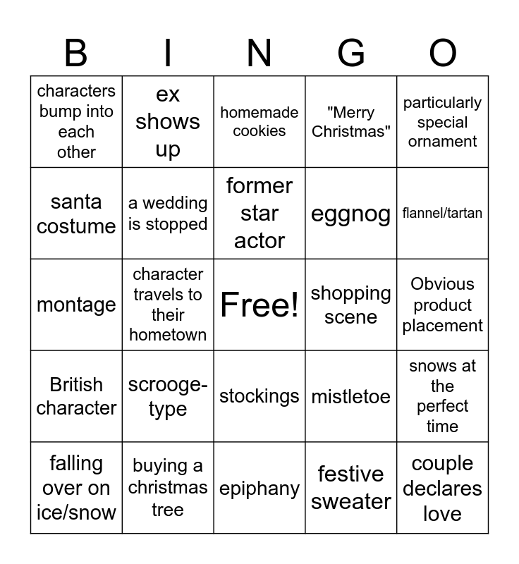 This bingo card has a free space and 51 words: way too wise kid, couple declares love, dancing, epiphany, scrooge-type, red dress, ex shows up, small town, santa costume, love triangle, a wedding is stopped, "Merry Christmas", snows at the perfect time, mistletoe, hot chocolate, dead parent, former star actor, shopping scene, carols, particularly special ornament, character travels to their hometown, festive sweater, characters bump into each other, eggnog, interrupted right before they kiss, single parent, flannel/tartan, 1st kiss right at the end, falling over on ice/snow, homemade cookies, snowball fight, "New York"/"Chicago", walk down the stairs dramatically, proposal, dog, buying a christmas tree, holding a mug in two hands, big misunderstanding, actors have zero chemistry, Magic?, Obvious product placement, British character, castle, nutcracker, horse and carriage, movie takes place in less than a week, montage, royalty, ice skating, stockings and character cries.