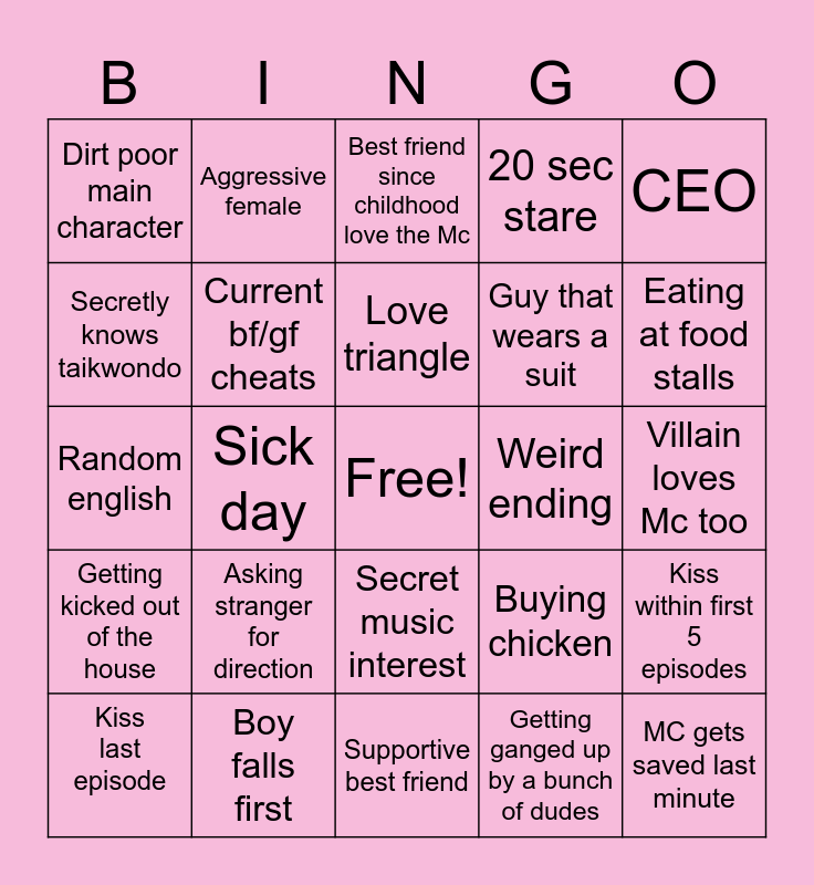 This bingo card has a free space and 29 words: Bad boy love interest, Boy falls first, Best friend since childhood love the Mc, Rich boy, CEO, Dirt poor main character, Current bf/gf cheats, Love triangle, Weird ending, Kiss within first 5 episodes, Kiss last episode, Sick day, Getting ganged up by a bunch of dudes, MC gets saved last minute, Random english, Parental issues, Supportive best friend, Buying chicken, Eating at food stalls, Getting kicked out of the house, Asking stranger for direction, Hiding from love interest, Guy that wears a suit, Villain loves Mc too, Secretly knows taikwondo, Aggressive female, Secret music interest, 20 sec stare and Defies the laws of physics.