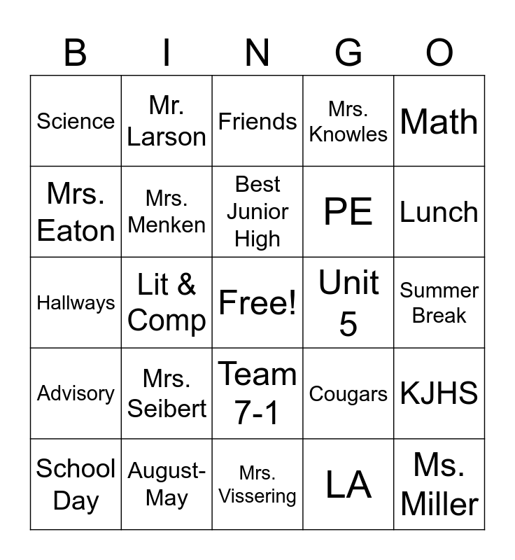 This bingo card has a free space and 49 words: Mr. Harris, Ms. Miller, Mrs. Starkey, Mrs. Vissering, Mrs. Seibert, Ms. Palmer, Mr. Larson, Mr. Davis, Mrs. Eaton, Mrs. Mattocks, Mrs. Menken, Mrs. Knowles, KJHS, Cougars, Kingsley Street, Junior High, Best Junior High, Unit 5, Social Studies, Math, Lit & Comp, LA, Science, PE, Exploratory, Lunch, School Day, Students, Team 7-1, Advisory, Simulations, Roller Coasters, Books, Laptops, August-May, Thanksgiving Break, Winter Break, Spring Break, Summer Break, Learn, Play, Study, Blooket, IMC, Hallways, Friends, Student ID, Kafooty and PBIS.