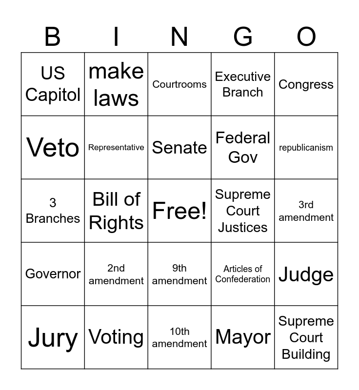 This bingo card has a free space and 59 words: 7 Principles, Voting, President, Governor, Mayor, Senator, Representative, State Gov, Federal Gov, Legislative Branch, Executive Branch, Judicial Branch, Veto, Veto Override, White House, US Capitol, Supreme Court Building, Congress, House of Reps, Senate, Supreme Court Justices, Courtrooms, Jury, Judge, Lawyer, Speedy Trial, US Constitution, popular sovereignty, republicanism, federalism, separation of powers, limited gov, individual rights, checks & balances, make laws, enforce laws, interpret laws, Bill of Rights, Preamble, 3 Branches, 1st amendment, 2nd amendment, 3rd amendment, 4th amendment, 5th amendment, 6th amendment, 7th amendment, 8th amendment, 9th amendment, 10th amendment, freedom of press, right to assemble, right to bear arms, freedom of religion, freedom of speech, Articles of Confederation, James Madison, states and US.
